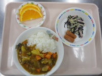 ウインナーソテー ひじきサラダ カレーシチュー ごはん オレンジ |
