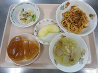 ナポリタン 小松菜サラダ 白菜のベーコンスープ ロールパン りんご |