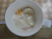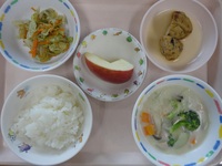 がんもどきの煮付け キャベツの磯和え サーモンシチュー ごはん りんご |