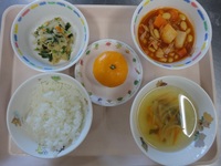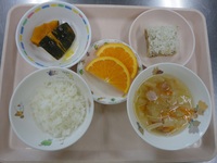 豚肉のもち米蒸し かぼちゃ煮 野菜とウインナーのスープ ごはん オレンジ |