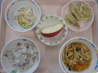 ちくわの磯辺揚げ ツナサラダ 煮込みうどん ゆかりごはん 柿 |
