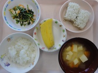 豚肉のもち米蒸し ほうれん草とささみの酢和え みそ汁(じゃが芋、玉ねぎ) ごはん バナナ |