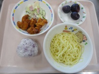 | お麩のきなこスナック | 鶏肉の唐揚げ ハムサラダ 流しラーメン ゆかりおにぎり ぶどう |