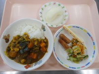 ウイニー チーズ キャベツのおかか和え 夏野菜カレー ごはん 梨 |