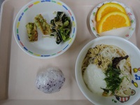 ちくわの磯辺揚げ 小松菜ともやしのお浸し 流しそうめん ゆかりごはん オレンジ |
