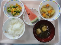 大豆の五目煮 ブロッコリーとコーンのおかか和え とろろ昆布汁 ごはん すいか |