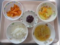 ポテトとコーンの重ね煮 にんじんの和風サラダ 野菜とウインナーのスープ ごはん ぶどう |