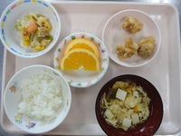 鶏肉の唐揚げ キャベツとコーンの中華和え かき玉汁 ごはん オレンジ |