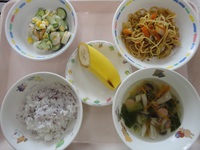 焼きそば きゅうりとちくわのサラダ しめじとチンゲン菜のスープ ゆかりごはん バナナ |