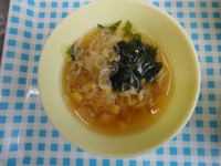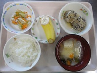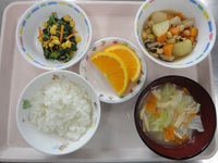 大豆の五目煮 青菜とコーンのごま和え みそ汁(うすあげ) ごはん オレンジ |