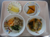 豚肉のカレー炒め ほうれん草の納豆和え 若竹汁 ごはん バナナ |
