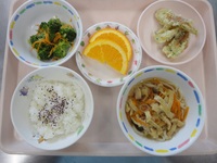ちくわの磯辺揚げ ブロッコリーのおかか和え 煮込みうどん ゆかりごはん オレンジ |