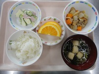 筑前煮 ハムサラダ すまし汁 ごはん オレンジ |