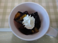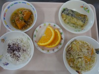 たらの磯辺焼 かぼちゃのそぼろ煮 ビーフンスープ ゆかりごはん オレンジ |