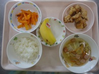 鶏肉の唐揚げ にんじんの和風サラダ 野菜とウインナーのスープ ごはん バナナ |