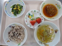ハンバーグソース煮 青菜とコーンのごま和え キャベツのベーコンスープ 赤飯 いちご ゼリー |