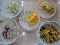 スパニッシュオムレツ にんじんの和風サラダ 白菜と春雨のスープ ごはん オレンジ |