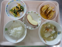 餃子のあんかけ 小松菜の中華和え 石狩汁 ごはん りんご |