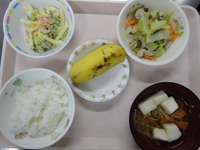 豚肉とキャベツのみそ炒め マカロニサラダ 白はんぺんのすまし汁 ごはん バナナ |