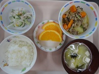 肉じゃが ツナサラダ みそ汁(わかめ) ごはん オレンジ |