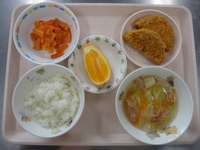 ミンチカツ にんじんの和風サラダ 洋風にゅう麺 ごはん いよかん |