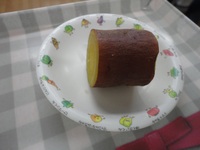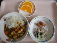 | 麩菓子 | ウインナーソテー 大豆とこんにゃくのサラダ カレーシチュー ごはん オレンジ |