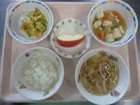 マーボー豆腐 ごま酢キャベツ 中華スープ ごはん りんご |