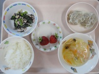 しゅうまい 小松菜とひじきのごまマヨ和え キャベツのベーコンスープ ごはん いちご |