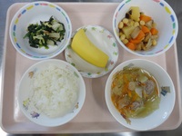 大豆の五目煮 白菜とほうれん草のおかか和え 肉団子スープ ごはん バナナ |