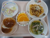ミートスパゲティ 白菜サラダ かぶとベーコンのスープ ロールパン オレンジ |
