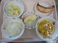 鮭の西京焼き スパゲティサラダ かき玉汁 ごはん りんご |