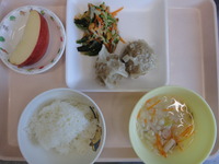 シューマイ ほうれん草の納豆和え 押し麦のスープ ごはん りんご |