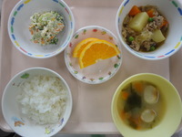 肉じゃが ブロッコリーとりんごの白和え みそ汁(麩) ごはん オレンジ |