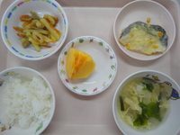 白身魚のクリームコーン焼き カレーきんぴら にら卵スープ ごはん 柿 |