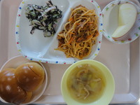 ナポリタン ひじきサラダ 玉ねぎとベーコンのスープ ロールパン りんご |