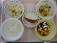 豚肉とキャベツのみそ炒め マカロニサラダ 豆腐のすまし汁(わかめ) ごはん りんご |