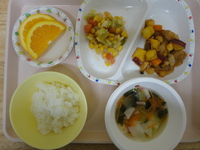 鶏とさつま芋の中華煮 キャベツとコーンの中華和え ワンタンスープ ごはん オレンジ |