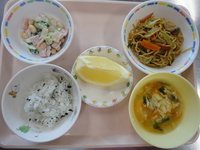 焼きそば 大豆とこんにゃくのサラダ コーン卵スープ わかめごはん グレープフルーツ |