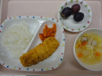 白身フライ にんじんの和風サラダ 野菜のコロコロスープ ごはん 巨峰 |