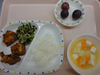 | ラスク | 鶏肉の唐揚げ 小松菜ともやしのお浸し みそ汁(じゃが芋、玉ねぎ) ごはん 巨峰 |