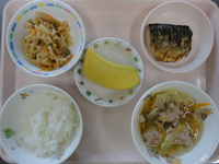 焼き鯖 切り干し大根の含め煮 肉団子スープ ごはん バナナ |