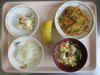 焼きそば マセドアンサラダ 青菜のみそかき玉汁 ごはん バナナ |