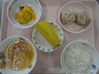 シューマイ かぼちゃと卵のサラダ 野菜とウインナーのスープ ごはん バナナ |