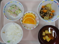 じゃが芋の昆布煮 ハムサラダ 卵豆腐の冷やし汁 ごはん オレンジ |
