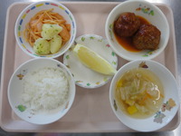 ハンバーグソース煮 スパゲティソテー 粉ふき芋 キャベツのベーコンスープ ごはん グレープフルーツ |