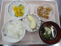 鶏肉の唐揚げ かぼちゃと卵のサラダ 味噌汁(えのき) ごはん りんご |