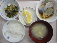 鯖の煮付け 五目和え 味噌汁(じゃが芋、うす揚げ) ごはん オレンジ |
