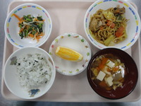 焼きそば 三色ナムル かき玉汁(大根) わかめごはん はっさく |