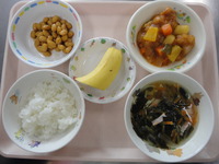酢鶏 大豆煮豆 中華風スープ ごはん バナナ |
