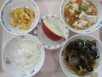 麻婆豆腐 キャベツとツナの炒めサラダ 中華風スープ ごはん りんご |